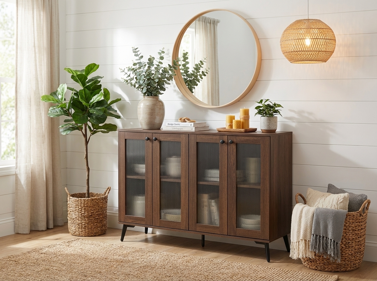 选用 MARLOWE 四门餐边柜,为您的餐厅或客厅增添一份沉稳的优雅感。 这款餐边柜采用深邃的胡桃木色 (Rich Walnut),展现出经典与现代交织的设计美学。柜体选用耐用的刨花板材质,底部配以坚固的金属腿,不仅结构稳固,也更方便日常清洁。其最大的特色在于私密性旭光/磨砂板 (Privacy Acrylic) 柜门面板,在巧妙遮挡内部餐具或杂物的同时,为家居增添了一份朦胧的视觉美感。凭借宽敞的四门储物空间,MARLOWE 餐边柜是打造整洁、高格调家居环境的理想选择。