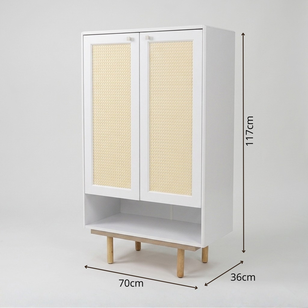 Introducing the MASSA Rattan living series, where style meets functionality. Crafted with particle board material and solid wood legs, it ensures durability and stability. The series features synthetic rattan door features complemented by a white cabinet body, exuding elegance and modernity. Perfect for organizing your living space while adding a touch of natural charm. Elevate your home decor with the MASSA Rattan living series, the perfect blend of practicality and aesthetic appeal.