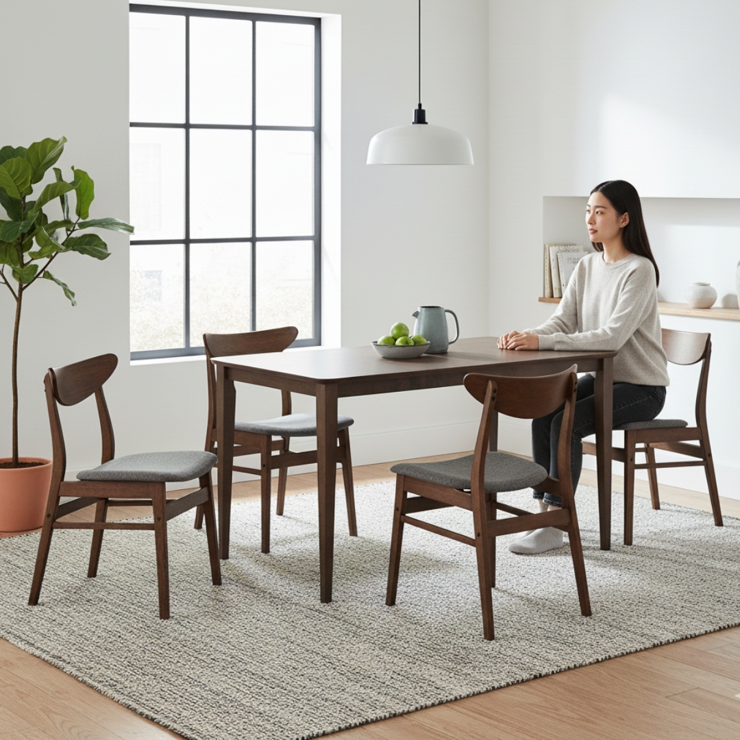 The MEISI 4-Seater Dining Set is crafted from solid rubberwood for strength and durability. Chairs feature fabric-cushioned seats with curved backrests for comfort. With a 140cm table length, it offers ample space for family dining. Finished in a natural wood tone, MEISI brings the calm and warmth of Japandi style to your home.