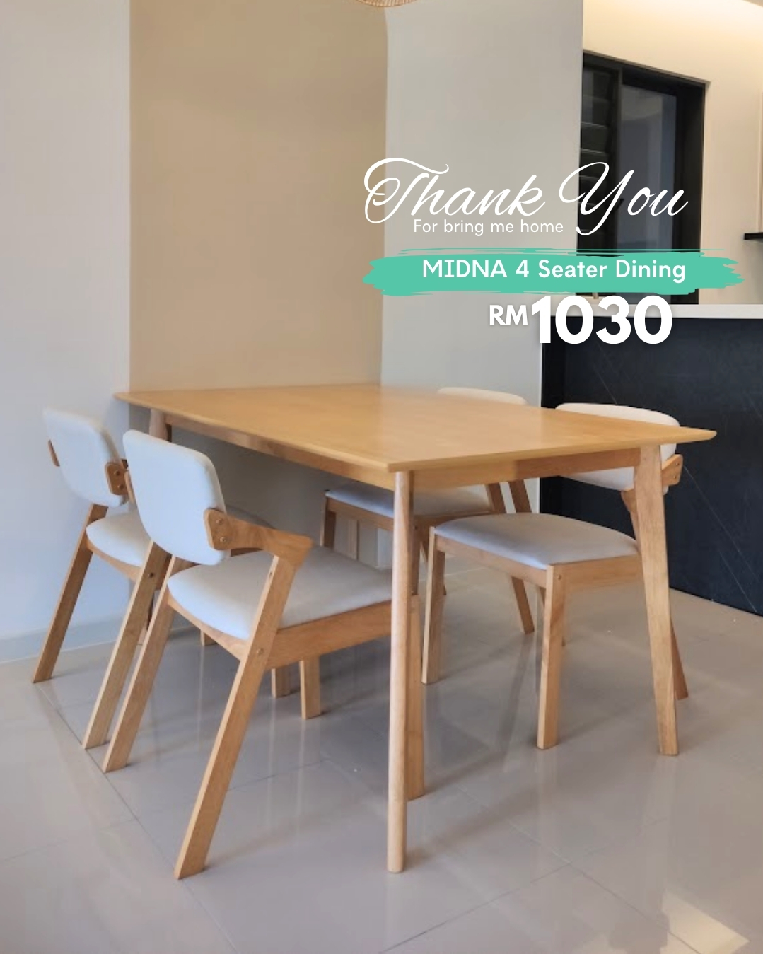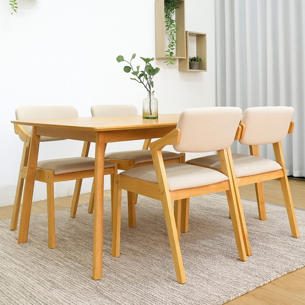 The MIDNA 4-Seater Dining Set blends natural charm with everyday comfort. Featuring a sturdy table and chair frame in a warm natural finish, it fits seamlessly into Japandi or modern interiors. Each chair comes with a soft cushion seat pad and backrest, offering added comfort for family meals and gatherings. A perfect balance of style and function for your dining space.