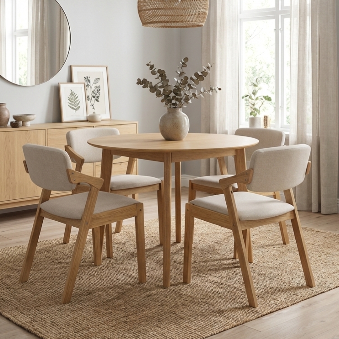 The MIDNA 4-Seater Round Dining Set blends timeless Japandi aesthetics with everyday functionality. Crafted entirely from solid rubberwood, it offers natural durability and warmth. The chairs feature soft fabric cushions on both seat and backrest for added comfort. Perfect for cozy meals and gatherings, this set brings calm elegance to any dining space.