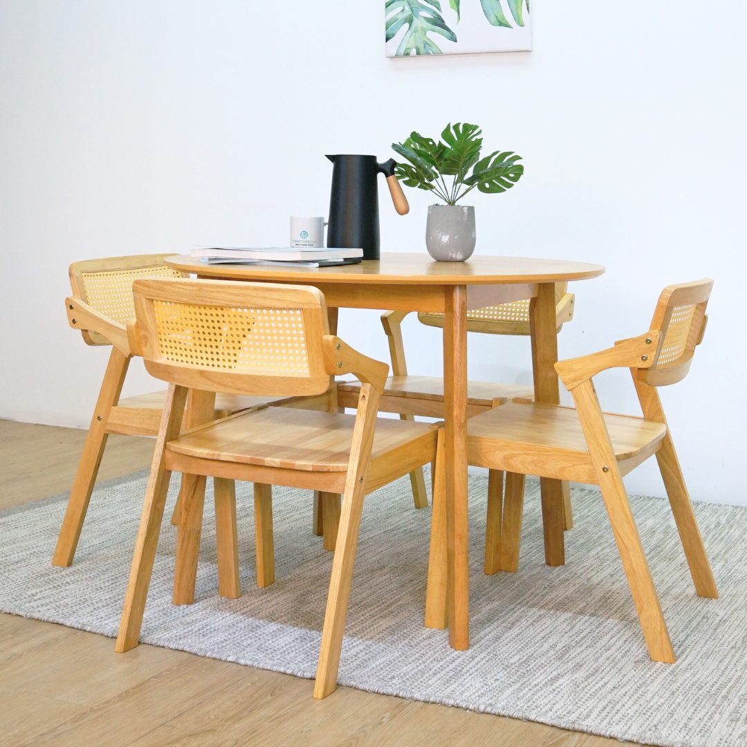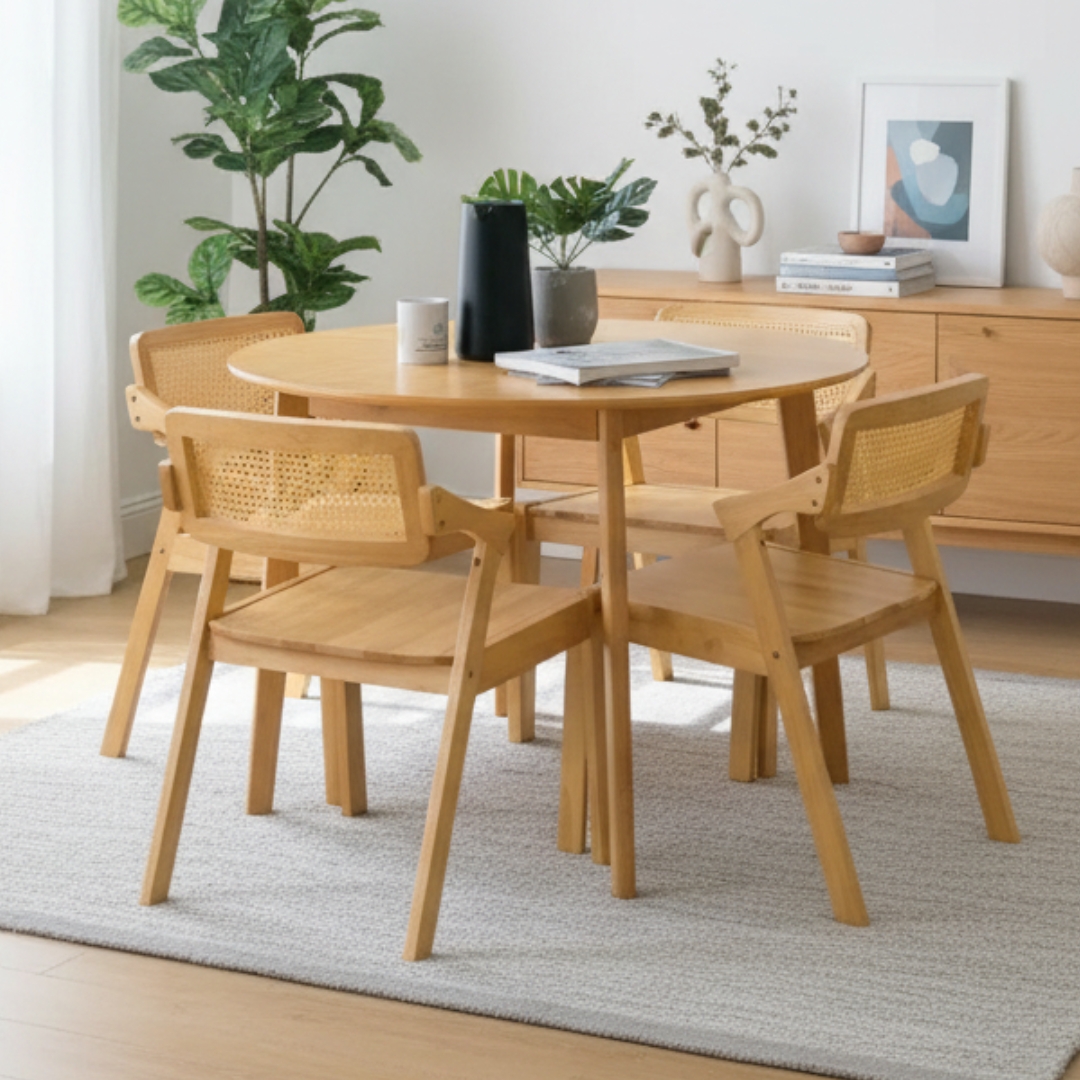 The MIDNA 4-Seater Round Dining Set blends timeless Japandi aesthetics with everyday functionality. Crafted entirely from solid rubberwood, it offers natural durability and warmth. The chairs feature soft fabric cushions on both seat and backrest for added comfort. Perfect for cozy meals and gatherings, this set brings calm elegance to any dining space.
