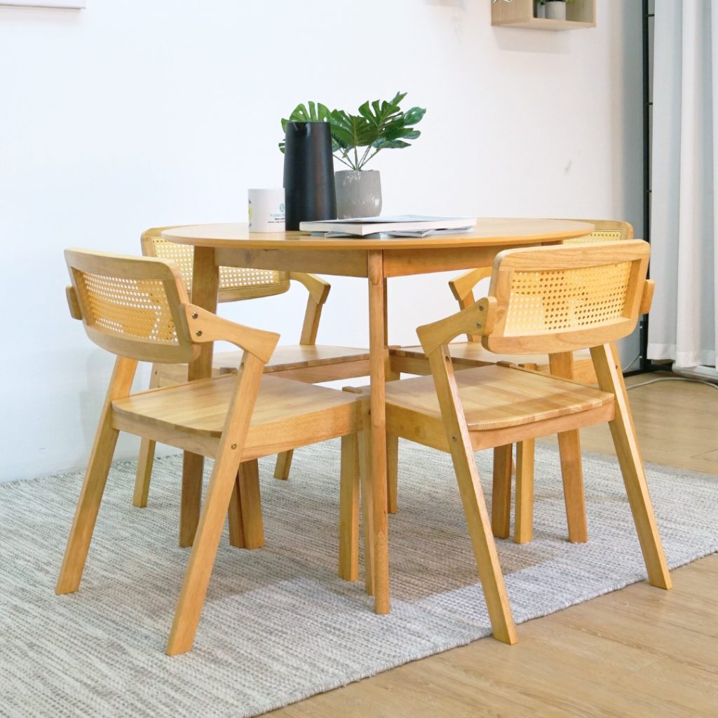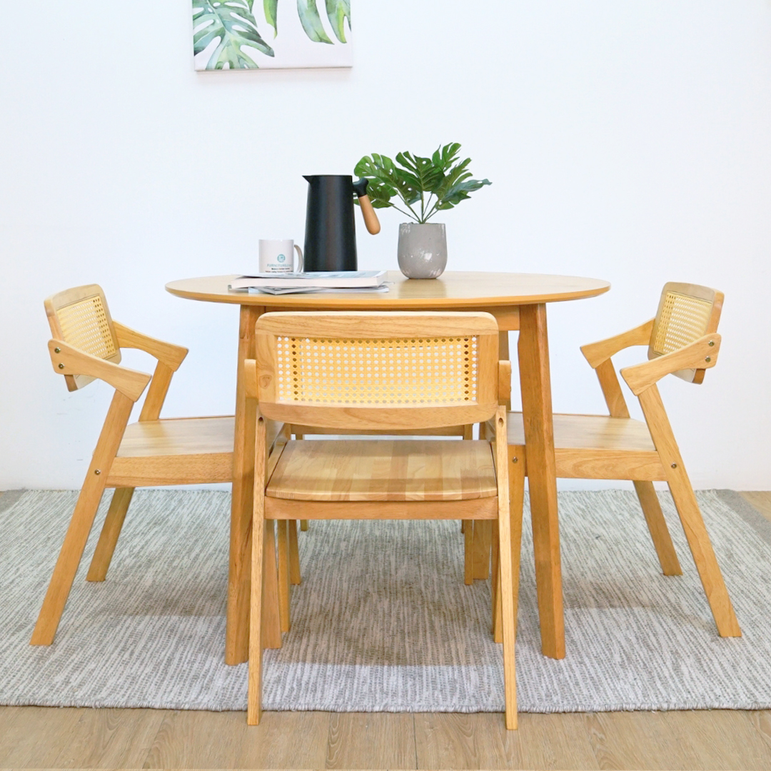 Set Meja Makan Bulat 4-Kerusi MIDNA menggabungkan rekaan Japandi yang tenang dengan fungsi harian. Diperbuat sepenuhnya daripada kayu getah padu, ia tahan lama dan memberi nuansa semula jadi. Kerusi dilengkapi kusyen fabrik pada tempat duduk dan sandaran untuk keselesaan tambahan. Sempurna untuk ruang makan yang santai dan bergaya.