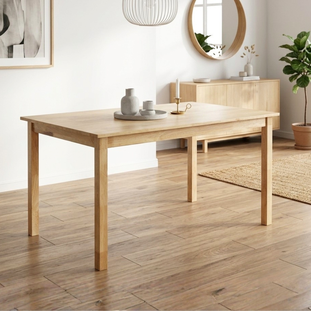 Introducing the MOKU 120cm Dining Table, crafted entirely from solid rubberwood. Featuring solid square table legs and a natural wood finish, this dining table embodies both strength and elegance. Its 100% solid wood construction provides durability and a timeless look that fits seamlessly into any home décor. The MOKU dining table is perfect for family gatherings, combining functionality and natural beauty in one classic design.