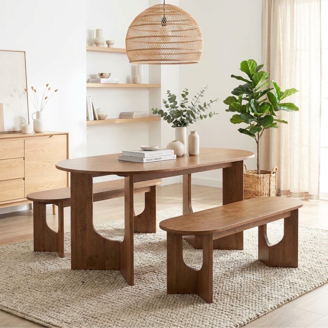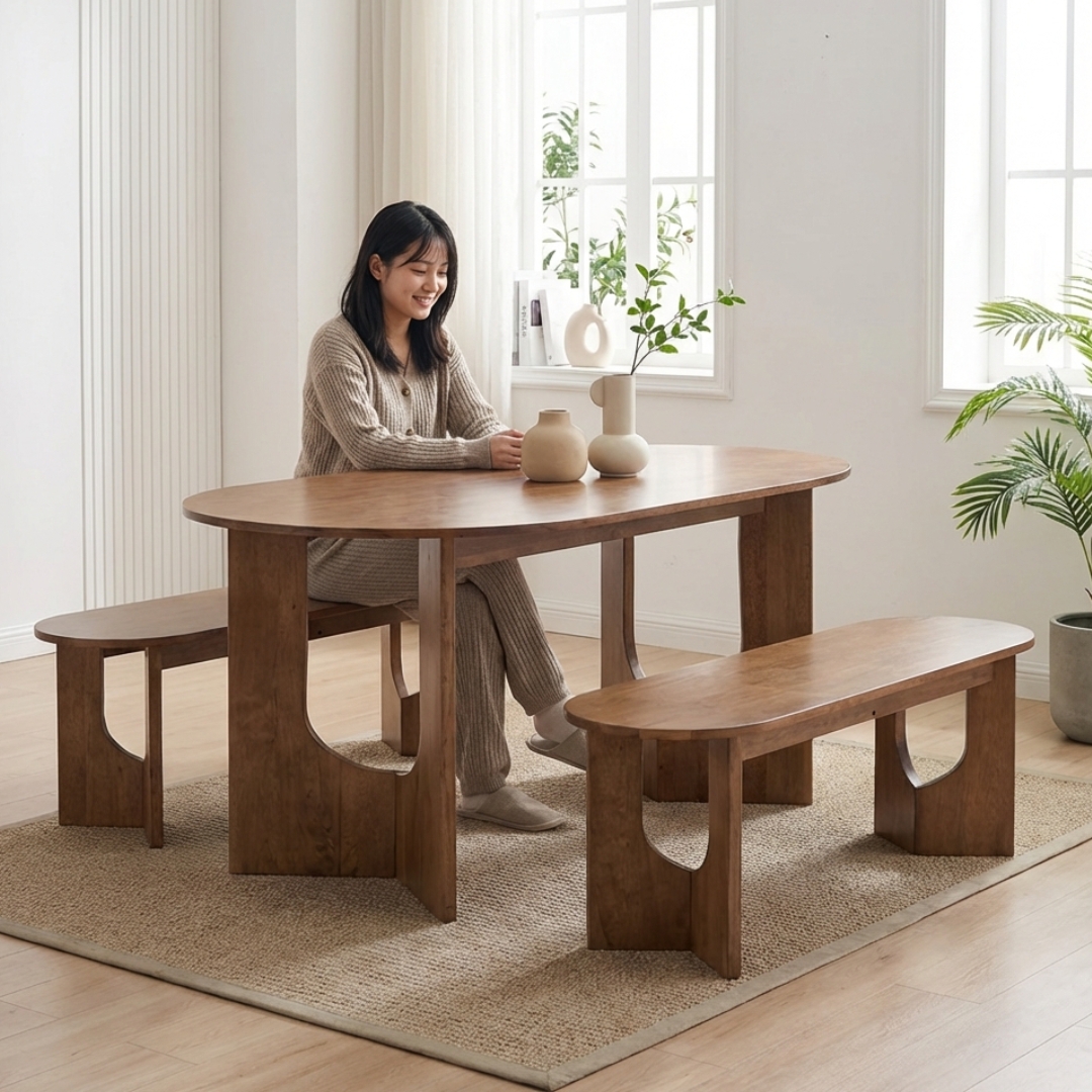 Embrace minimalist elegance with the MOSS 4-Seater Dining Set. Crafted from full solid rubberwood, this Japandi-style collection features a signature rounded tabletop and matching benches. Its soft curves and natural wood grains create a warm, organic atmosphere, making it the perfect centerpiece for a cozy, modern home.