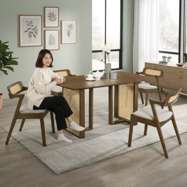 Hiasi ruang makan dengan Set Meja Makan 4-Tempat Duduk MOSS. Bertemakan gaya Japandi, set ini diperbuat sepenuhnya daripada kayu getah asli (solid rubberwood). Rekaan meja dan bangku berbucu bulat memberikan sentuhan lembut dan harmoni, sesuai untuk mereka yang mementingkan gaya hidup minimalis dan semula jadi.