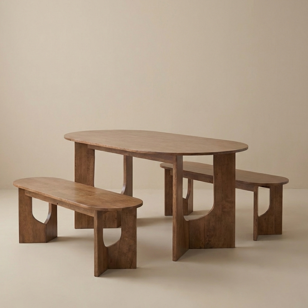 Embrace minimalist elegance with the MOSS 4-Seater Dining Set. Crafted from full solid rubberwood, this Japandi-style collection features a signature rounded tabletop and matching benches. Its soft curves and natural wood grains create a warm, organic atmosphere, making it the perfect centerpiece for a cozy, modern home.