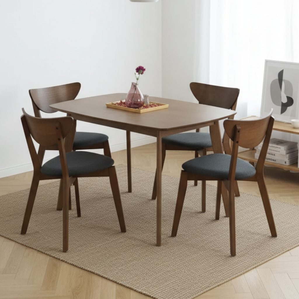 Set Meja Makan 4 Tempat Duduk NAIDA hadir dengan warna walnut yang mewah untuk suasana hangat dan elegan.