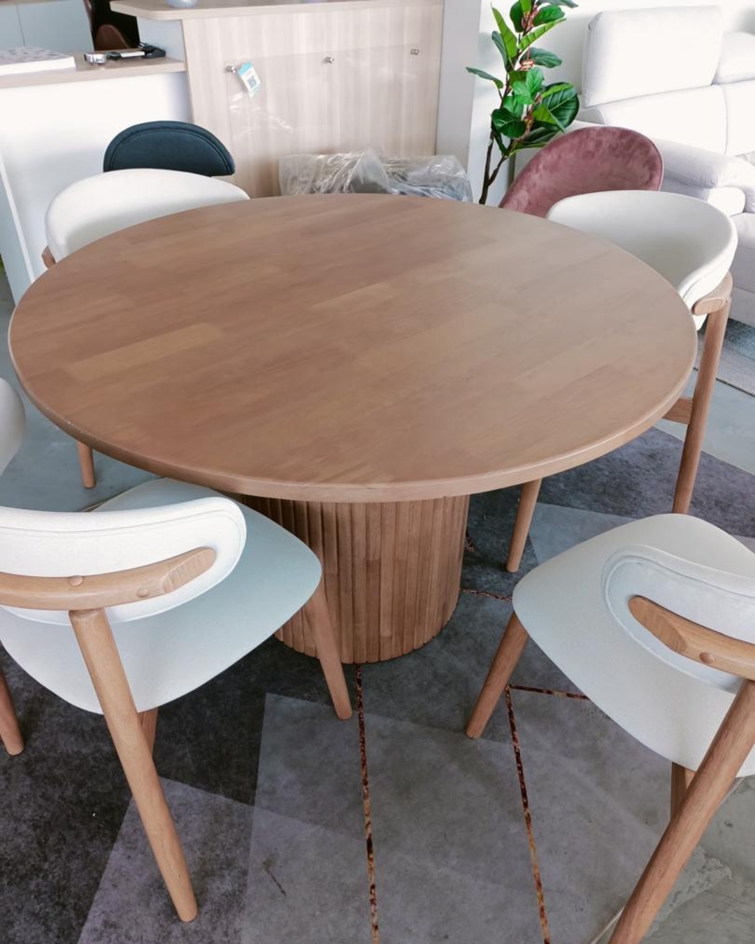 NISA 四人圆形餐桌套装,为您的用餐空间增添温馨与格调。全套采用实心橡胶木打造,坚固耐用,展现自然木质美感。圆形餐桌配有优雅的凹槽底座,搭配四把弧形靠背餐椅,座面采用易清洁布料,方便日常维护。NISA 餐桌套装融合经典工艺与现代舒适,为您营造温馨实用的用餐环境。