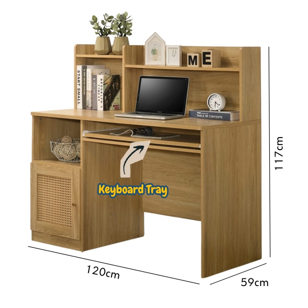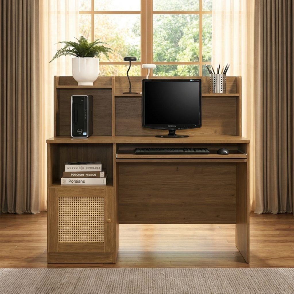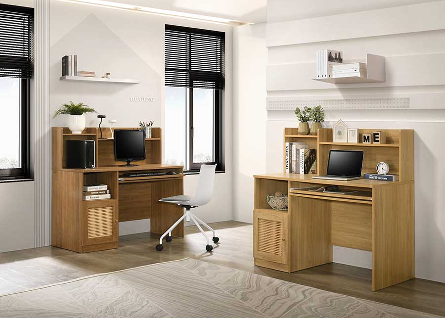 Bring natural texture to your work zone with the NOLA Study Desk. This compact, all-in-one workstation is designed to maximize utility without sacrificing style. The standout feature is the chic rattan cane insert on the left cabinet door, adding a warm, bohemian touch. NOLA includes an integrated hutch with ample shelving and a convenient pull-out keyboard tray to keep your desktop clutter-free. Finished in a cozy natural wood tone, this desk is the perfect solution for creating a focused, inviting, and highly organized workspace in any tight area.