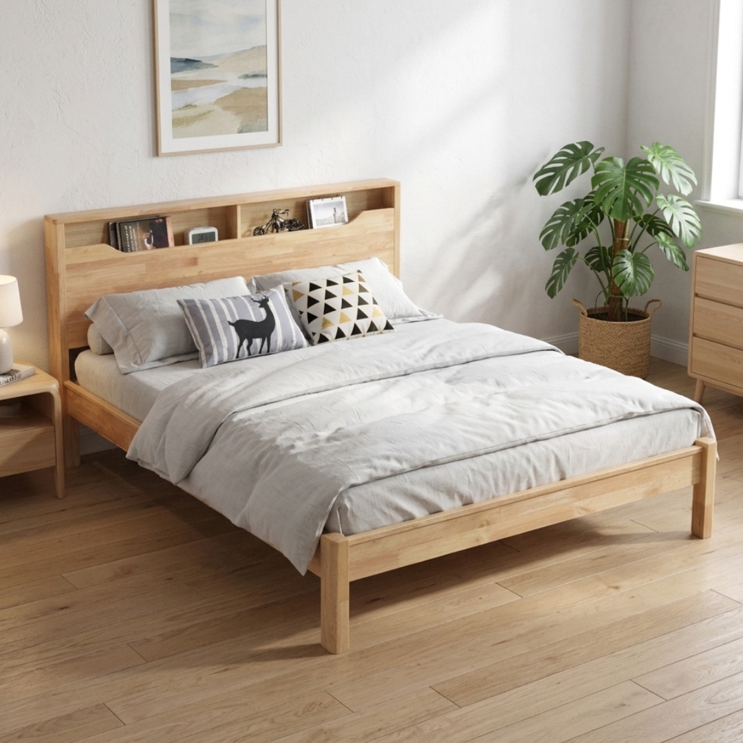 Rangka Katil Kayu Padu OGAKI diperbuat sepenuhnya daripada kayu getah padu dengan kemasan semula jadi. Kepala katil dilengkapi ruang simpanan terbina untuk menyimpan buku, peranti atau barangan keperluan. Reka bentuk minimalis dan tahan lama ini sesuai untuk hiasan dalaman gaya Japandi atau moden semula jadi.