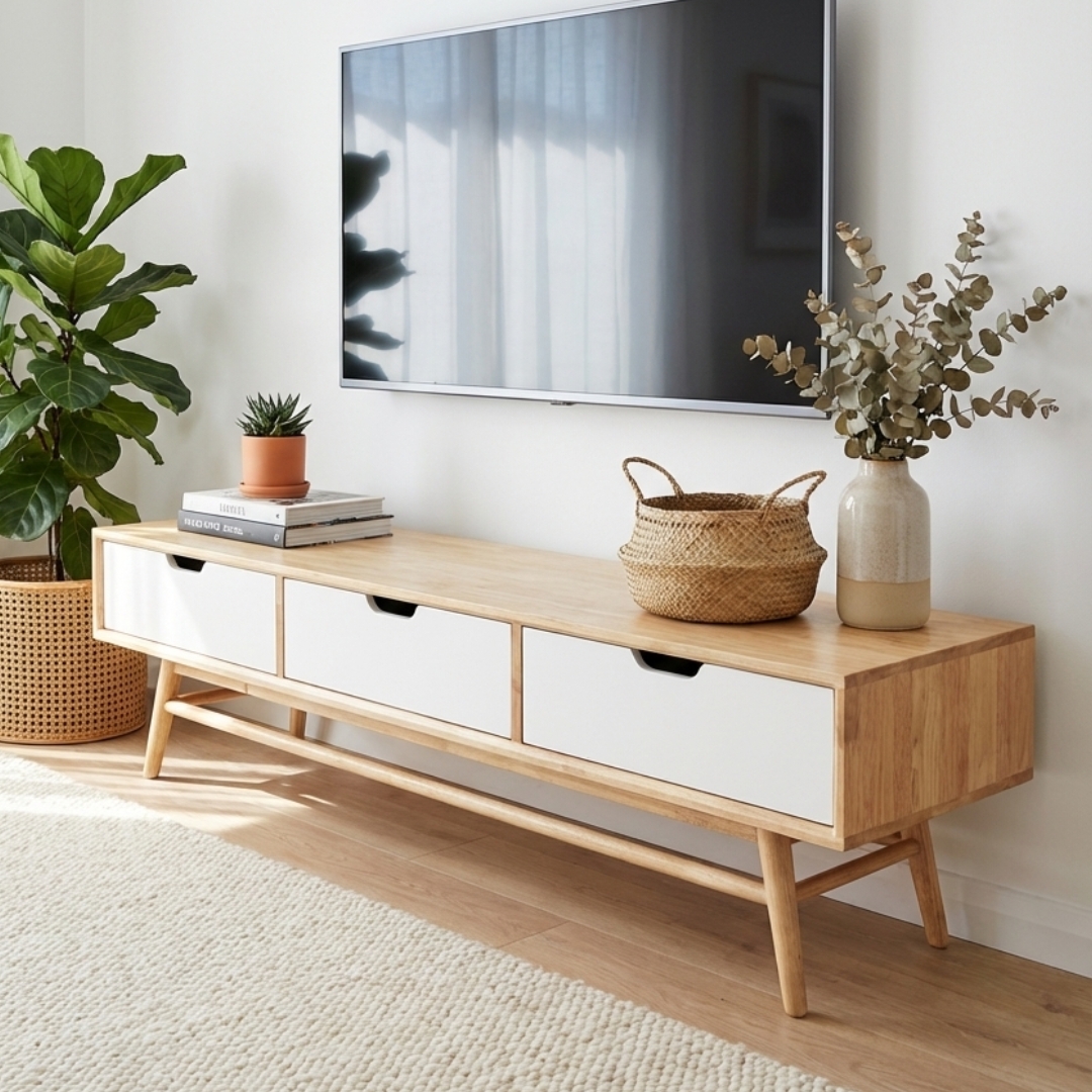 Anchor your living space with the minimalist elegance of the OMODA TV Cabinet. This 180cm console is crafted from premium, durable Solid Rubberwood, perfectly embodying the serene Japandi style with its clean lines and natural aesthetic. Featuring three smooth-gliding drawers, it offers ample storage for media and accessories, ensuring your space remains tranquil and clutter-free. Available in two versatile finishes—Natural for a light, airy look or rich Walnut for a classic contrast—the OMODA is built to be a timeless, high-quality centerpiece.