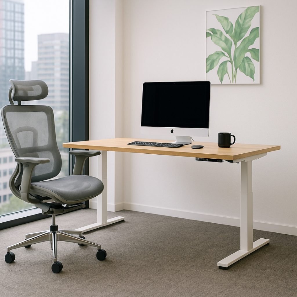 Set ini termasuk meja berdiri elektrik dan kerusi pejabat ergonomik dengan tempat letak kaki, direka untuk keselesaan dan produktiviti maksimum.