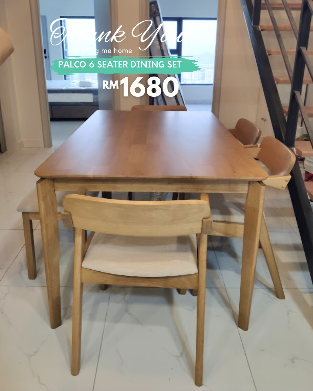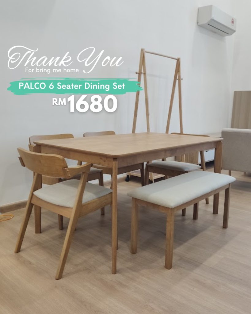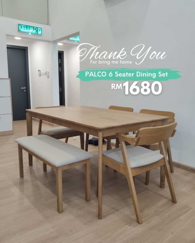 Set Meja Makan 6 Tempat Duduk PALCO diperbuat sepenuhnya daripada kayu getah padu yang tahan lama. Didatangkan dengan 4 kerusi dan 1 bangku, ia memberi fleksibiliti dalam susunan tempat duduk. Kusyen fabrik yang selesa serta sandaran kayu melengkung menambah keselesaan ergonomik—sempurna untuk jamuan keluarga atau bersama tetamu.