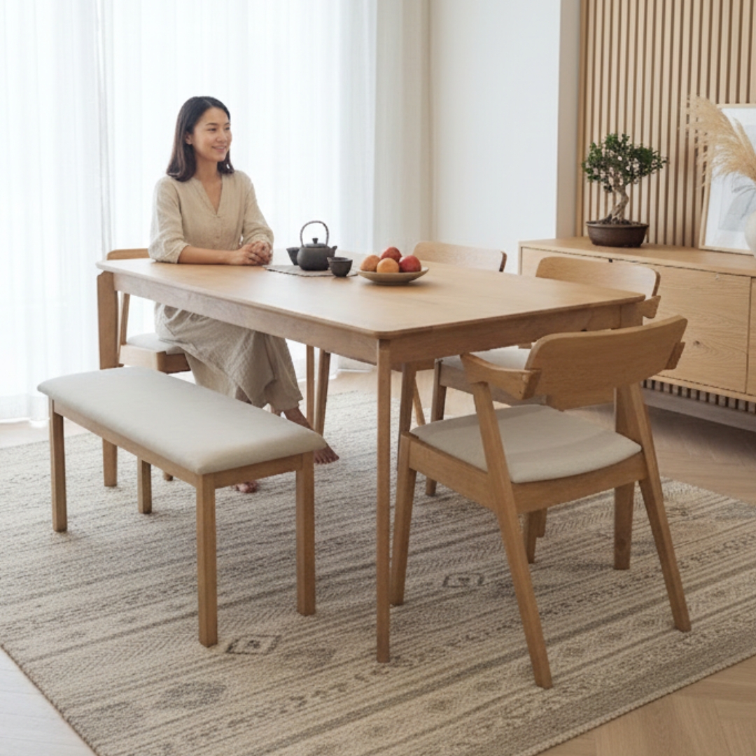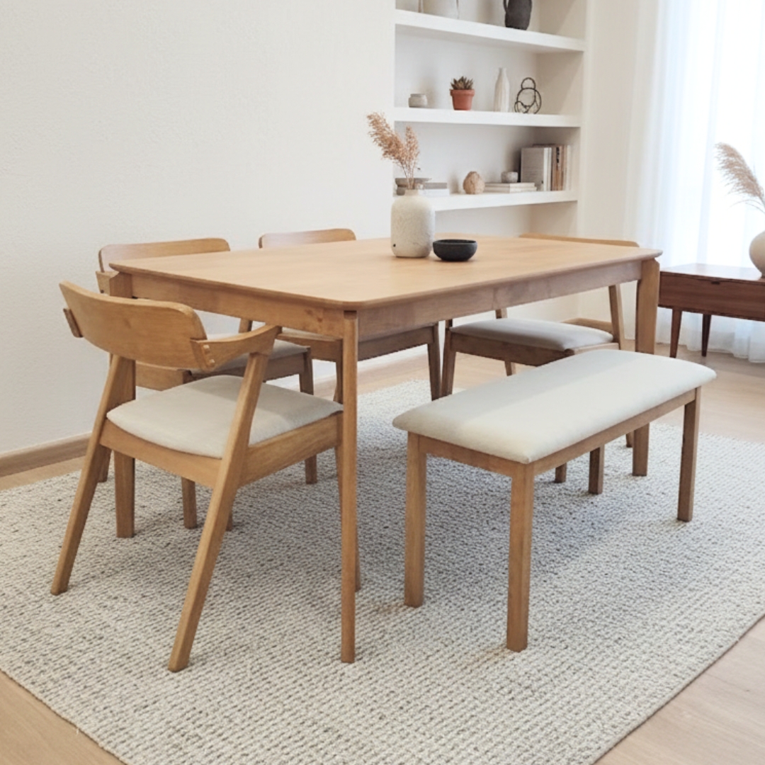 The PALCO 6-Seater Dining Set is made from full solid rubberwood, ensuring strength and durability. Featuring 4 chairs and 1 bench, it offers versatile seating options for family and guests. Fabric-cushioned seats and solid wood curved backrests provide ergonomic comfort, making every meal warm and enjoyable.