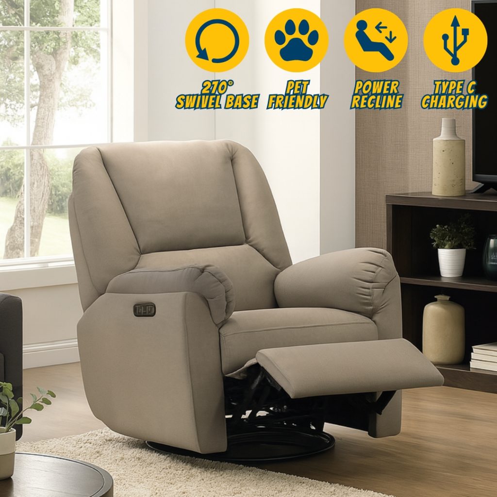 The CLORIS Power Recliner offers ultimate comfort and modern convenience. Upholstered in pet-friendly, easy-clean fabric, it’s perfect for busy homes. Enjoy smooth 270-degree swivel movement and effortless reclining, complete with a built-in Type-C charging port to keep your devices powered. The pocket spring seat with high-density foam ensures lasting support and relaxation—ideal for your living space.