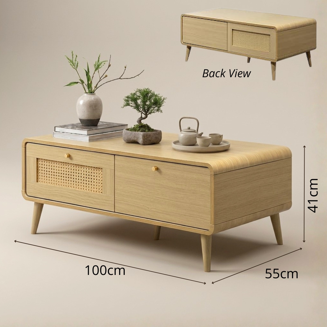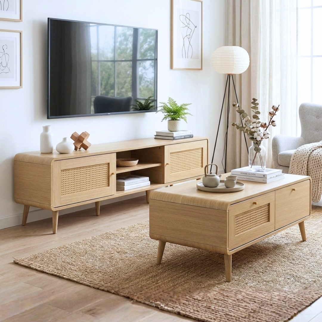 Embrace the harmony of nature with the PODERE Living Room Series. Inspired by the serene Japandi style, this collection blends Japanese minimalism with Scandinavian functionality. Crafted from durable particle board in a warm natural wood tone, each piece features soft curved edges at the corners for a safe and organic silhouette. The standout feature is the synthetic rattan door panels, offering a timeless woven texture that is easy to maintain. Perfect for creating a calm, airy atmosphere in your modern living space.