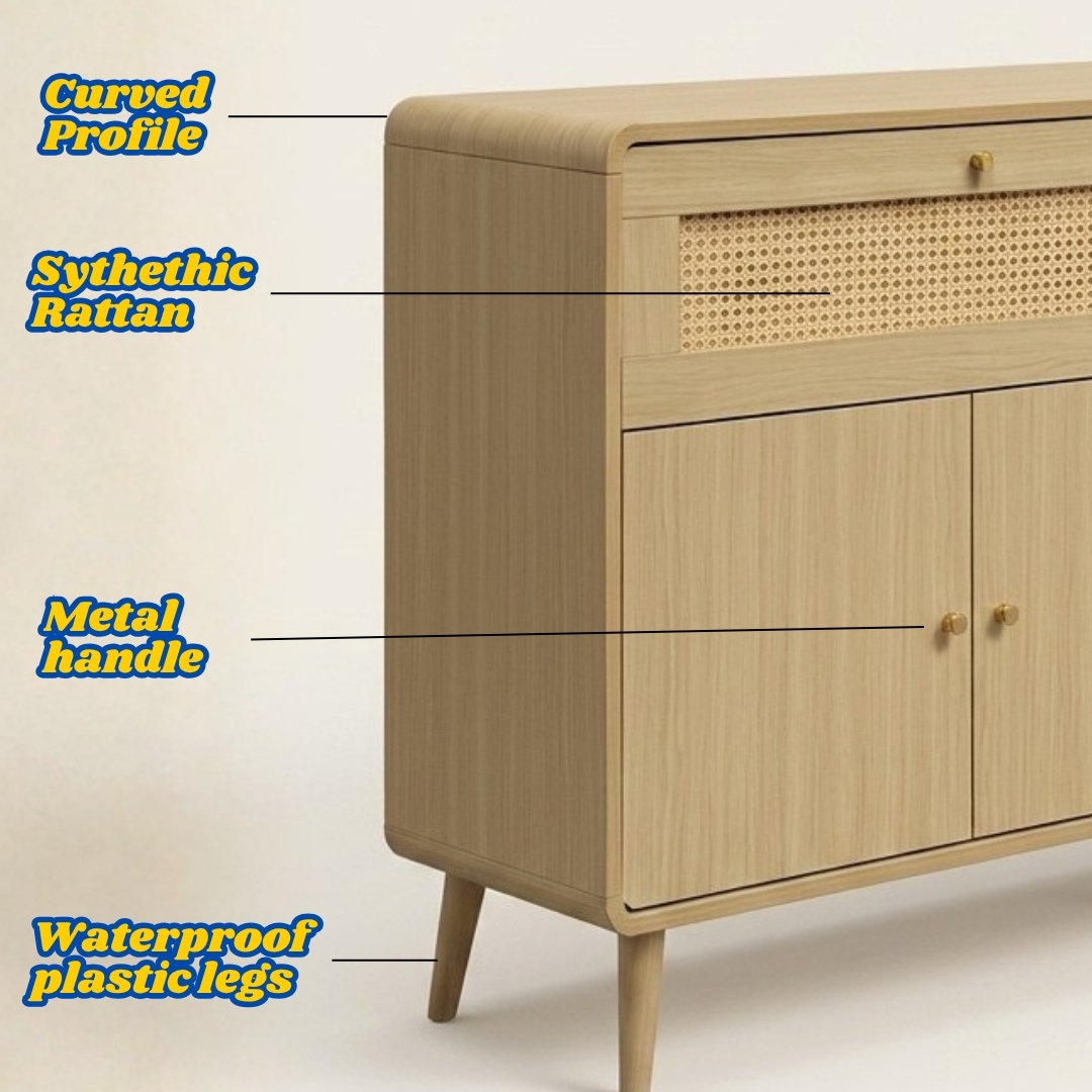Embrace the harmony of nature with the PODERE Living Room Series. Inspired by the serene Japandi style, this collection blends Japanese minimalism with Scandinavian functionality. Crafted from durable particle board in a warm natural wood tone, each piece features soft curved edges at the corners for a safe and organic silhouette. The standout feature is the synthetic rattan door panels, offering a timeless woven texture that is easy to maintain. Perfect for creating a calm, airy atmosphere in your modern living space.