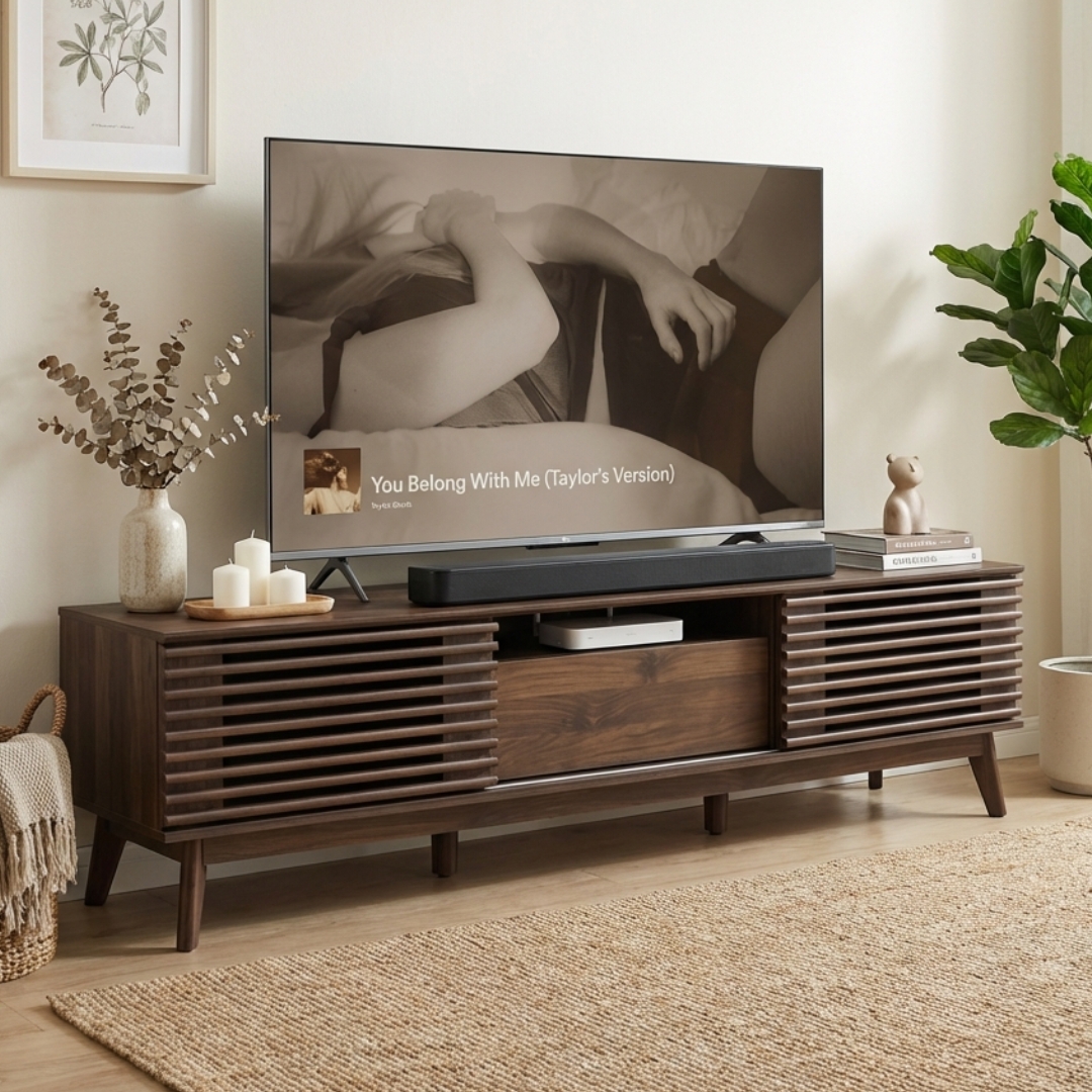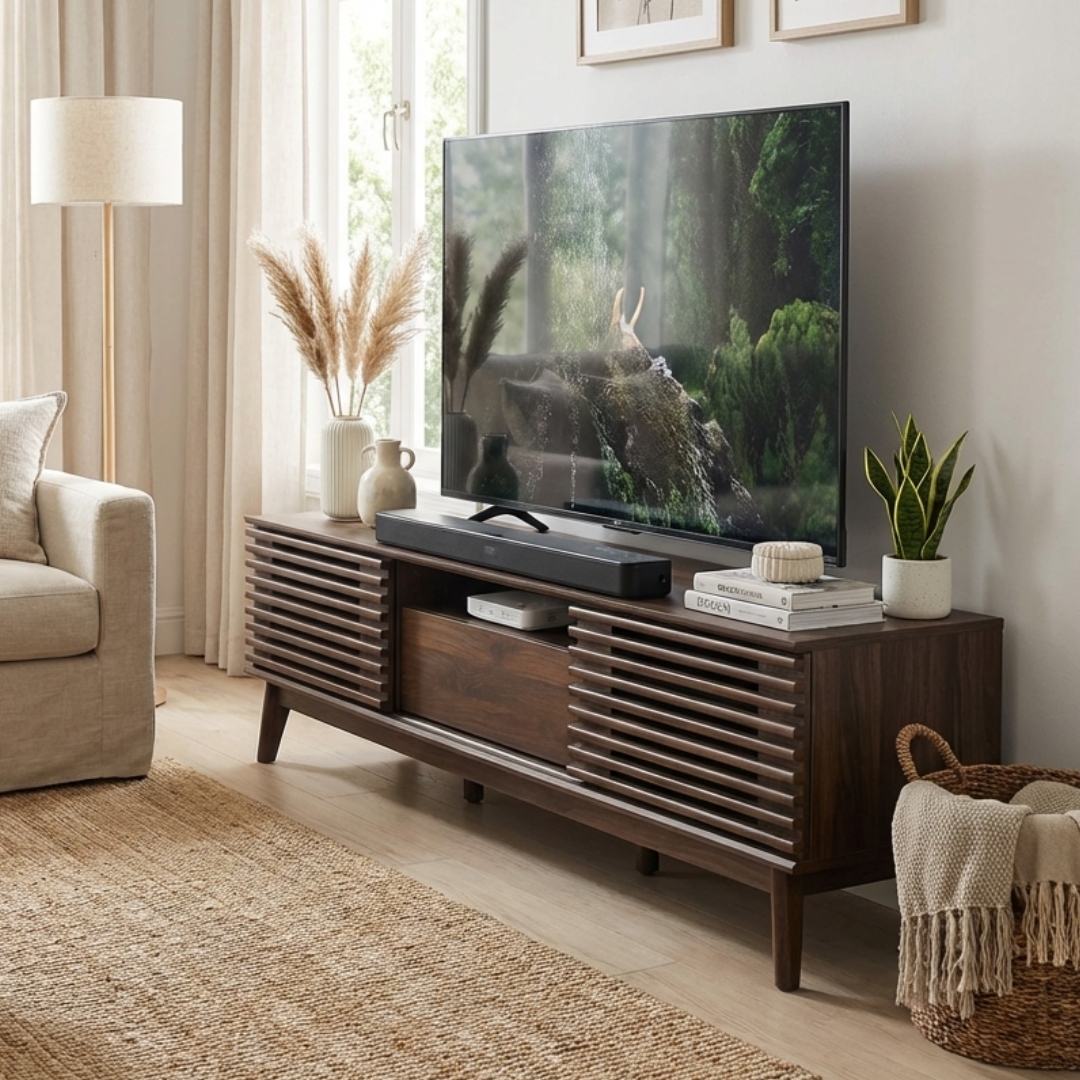 PRATO 180cm 移门电视柜,以自然纹理提升家居格调。柜门采用独特的横向木条格栅设计,不仅美观且富有层次感。柜体由刨花板打造,并搭配坚固的实木橡胶木桌脚。配备双移门与单抽屉储物空间,让您的客厅收纳变得更加轻松、有序且充满现代感。