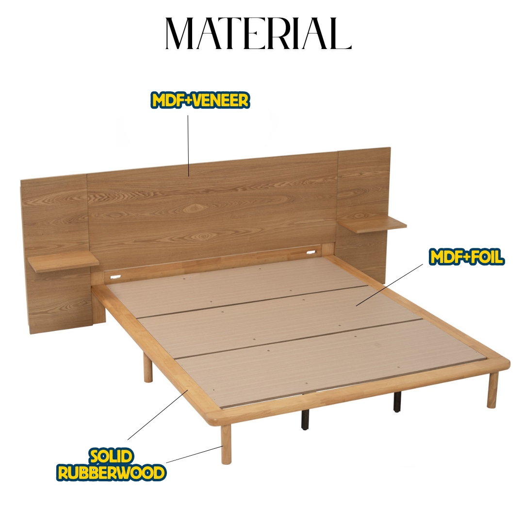 Rangka Katil Gaya Japandi PROTO diperbuat daripada kayu padu, menampilkan rekaan bersih dan semula jadi yang menenangkan. Kepala katil panel besar dilengkapi rak terapung di kedua-dua sisi untuk meletak buku atau aksesori. Reka bentuk bucu katil yang melengkung memberi keselamatan dan estetika lembut—sempurna untuk ruang tidur moden minimalis.