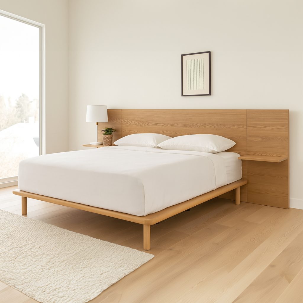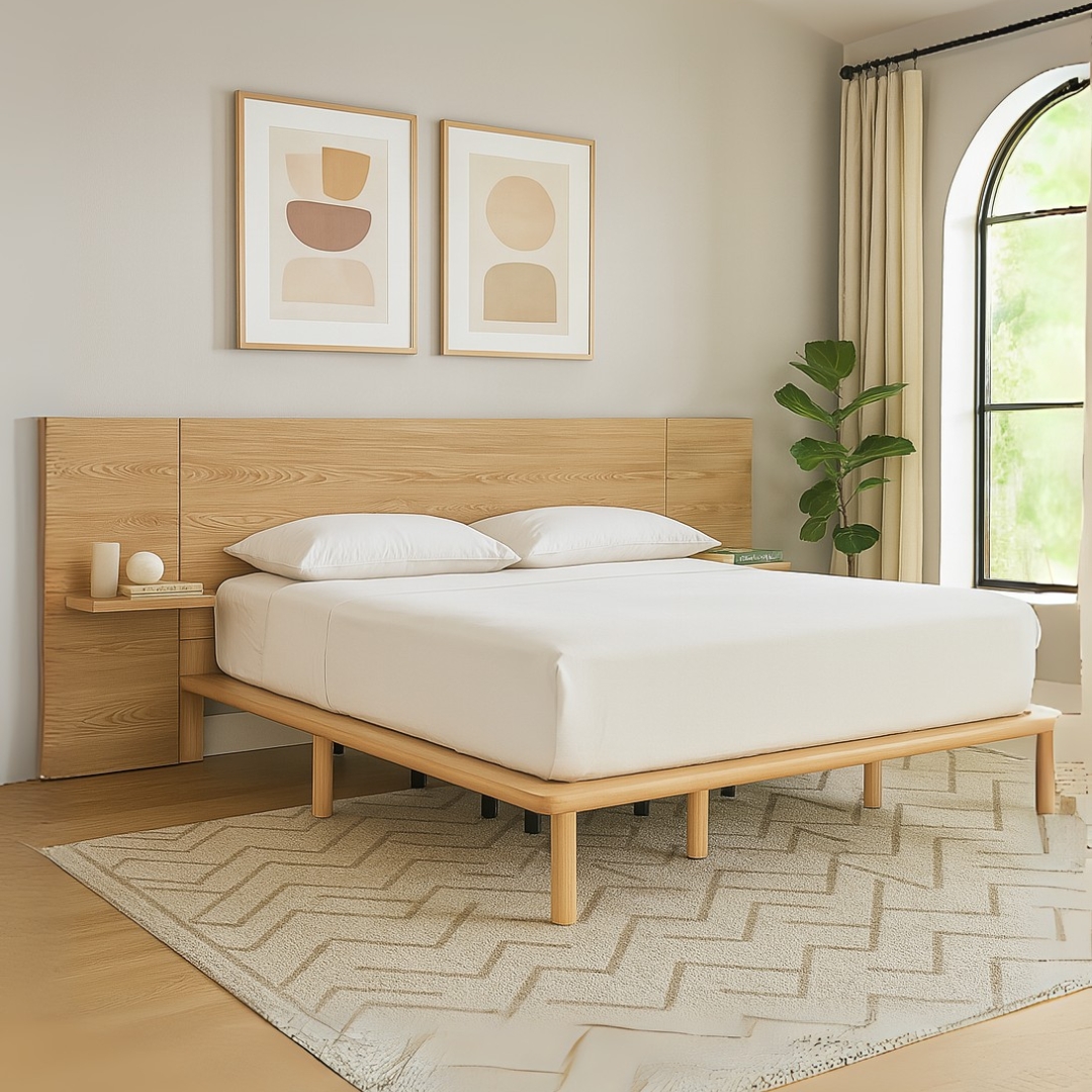 The PROTO Bed Frame brings Japandi elegance into your bedroom with its clean lines and calming natural design. Crafted from solid wood, it features a large panel headboard with integrated floating shelves on both sides—perfect for placing books, glasses, or decor. The rounded, curved edges at the bed base enhance both safety and softness in design, making it an ideal centerpiece for modern minimalist living.