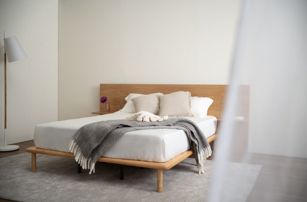 PROTO 日式北欧风床架,以实木打造,展现温润简约的美感。大尺寸床头板两侧配有悬浮式收纳层架,方便放置书本、眼镜或小物件。床架边角采用圆弧设计,安全又柔和,是现代极简卧室的理想之选。
