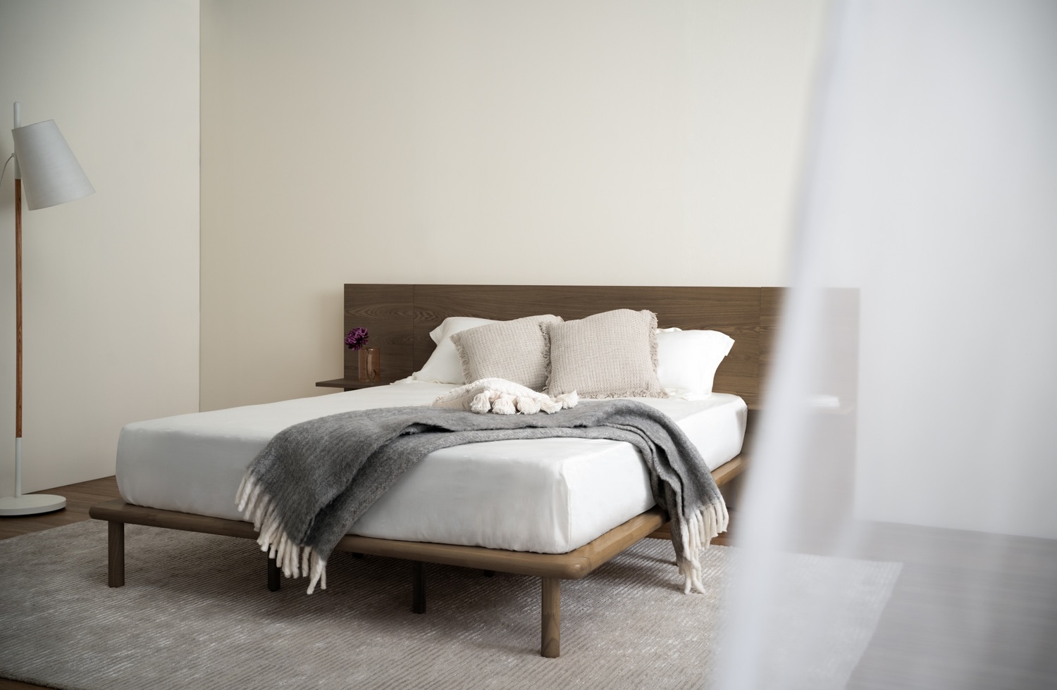 PROTO 日式北欧风床架,以实木打造,展现温润简约的美感。大尺寸床头板两侧配有悬浮式收纳层架,方便放置书本、眼镜或小物件。床架边角采用圆弧设计,安全又柔和,是现代极简卧室的理想之选。