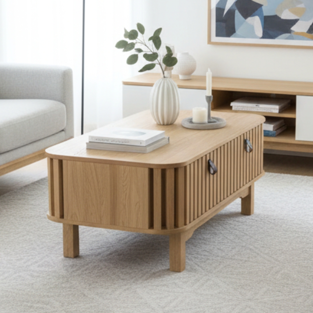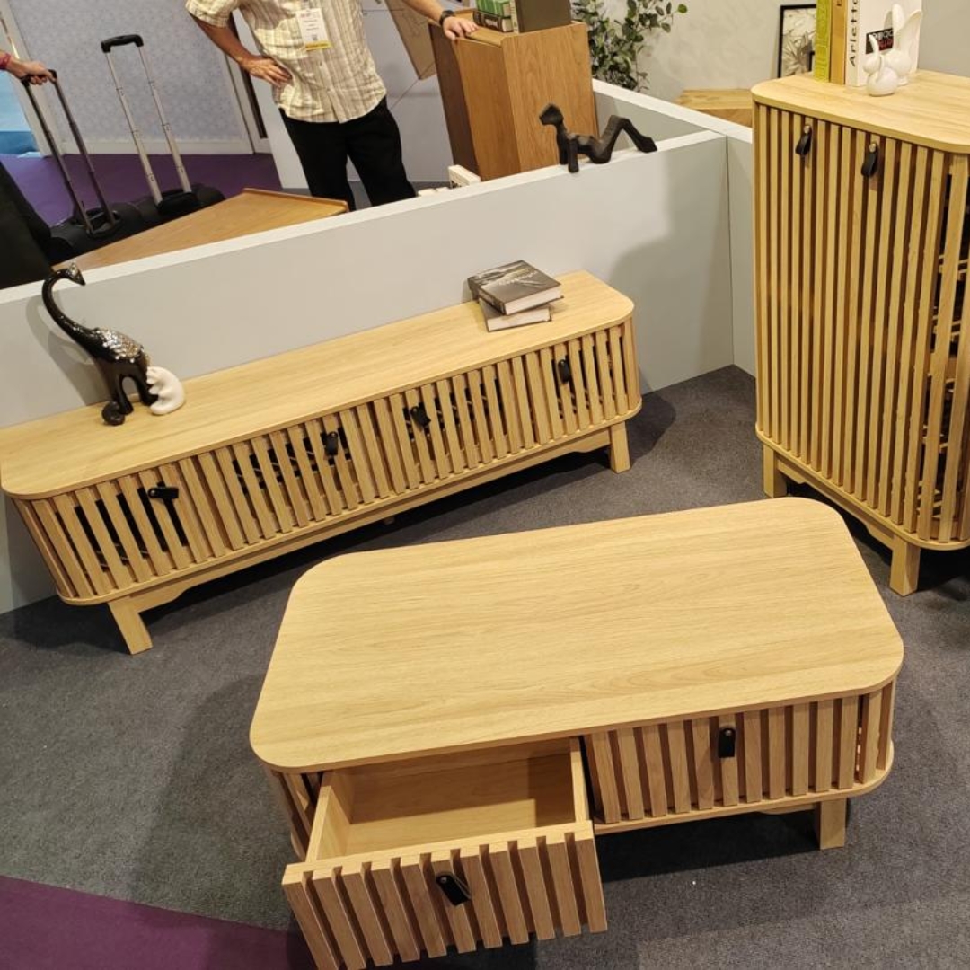 ROGANTA 客厅系列,包含电视柜、茶几与储物柜,一站式打造整体客厅风格。独特的 斜纹木质设计 搭配 3D 木纹贴皮工艺,质感逼真,触感细腻。无论是收纳还是展示,都兼顾实用与美观,让客厅更具层次与品位。
