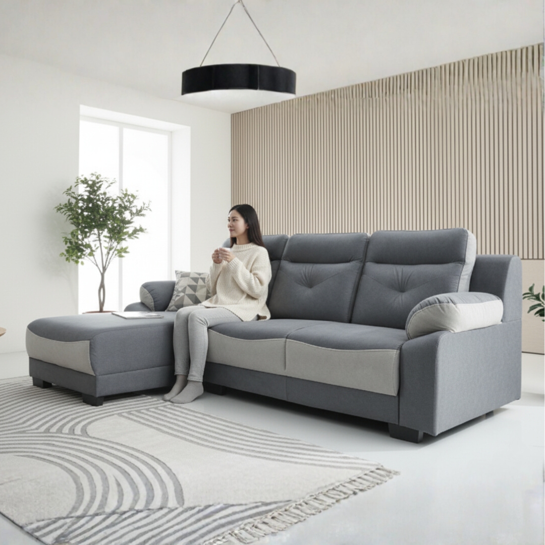 The ROMANA L-Shaped Sofa is upholstered in pet-friendly fabric that’s scratch-resistant and easy to clean—perfect for modern homes. Available in left or right configurations, it adapts to any room layout. The two-tone fabric design adds visual depth and style, offering both comfort and elegance for your living space.