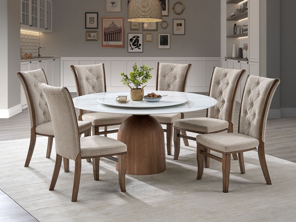 ROSALIE Artificial Marble 6 Seater Round Dining Set-Walnut