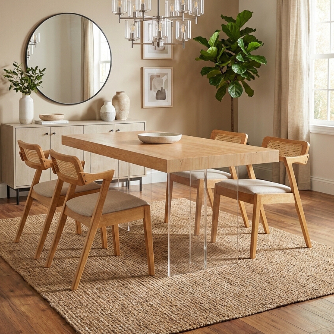 Make a bold statement with the SAFFRON 4-Seater Dining Set. This masterpiece features a thicker wood veneer tabletop that exudes natural warmth, uniquely paired with a transparent acrylic base. The clear table legs create a stunning “floating” illusion, bringing a sense of lightness and avant-garde luxury to your modern dining space.
