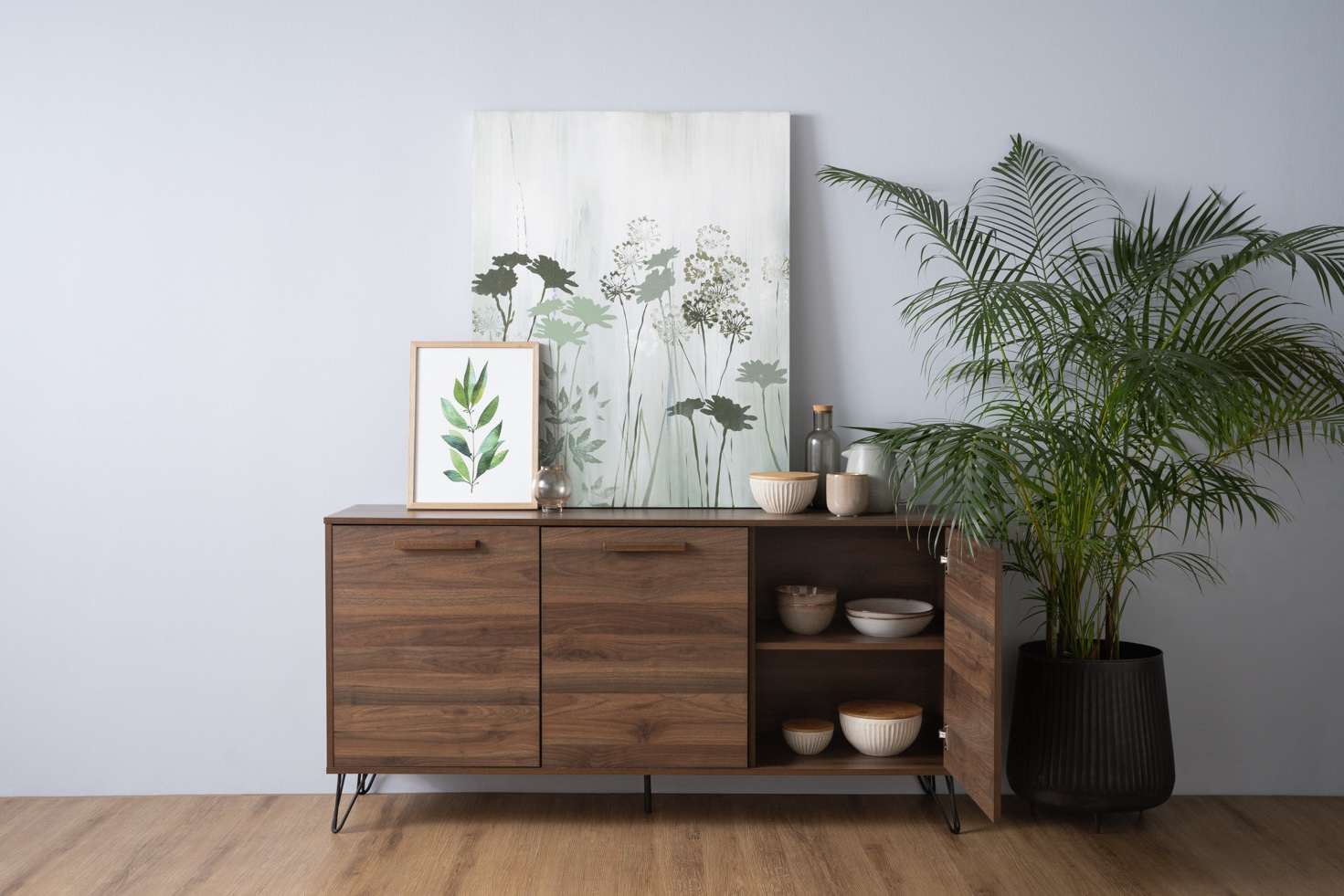 SIMON 三门餐边柜,以颗粒板柜体搭配金属发夹脚,展现轻盈时尚感。木质把手点缀自然细节,简约耐看。内部多层收纳空间,轻松容纳餐具、书籍或日常用品。提供橡木色与胡桃色两种选择,适合现代与北欧风家居。