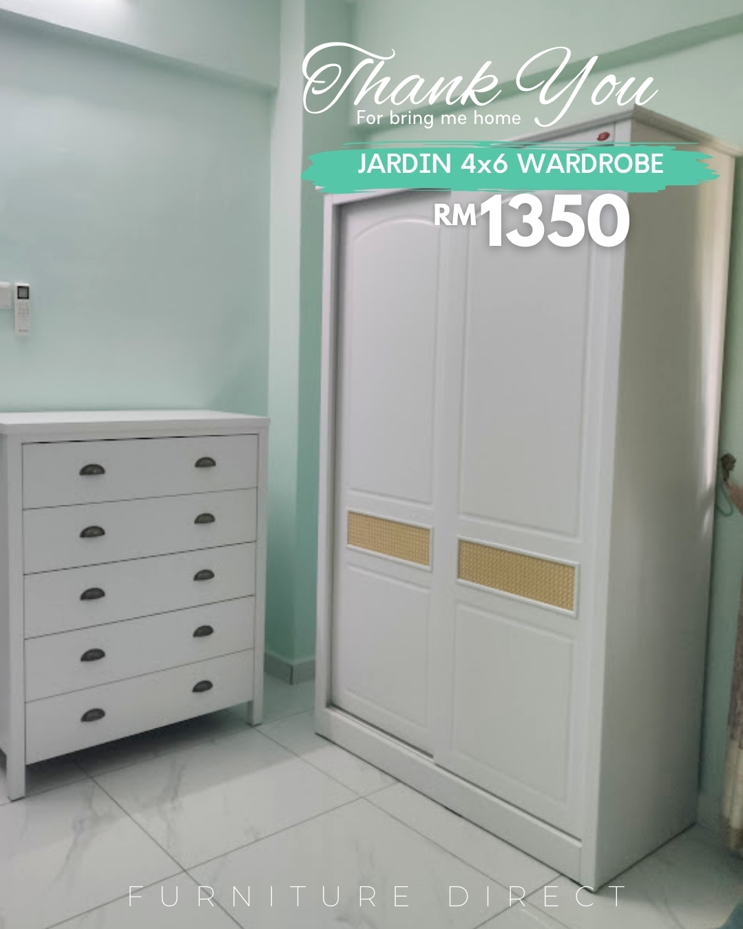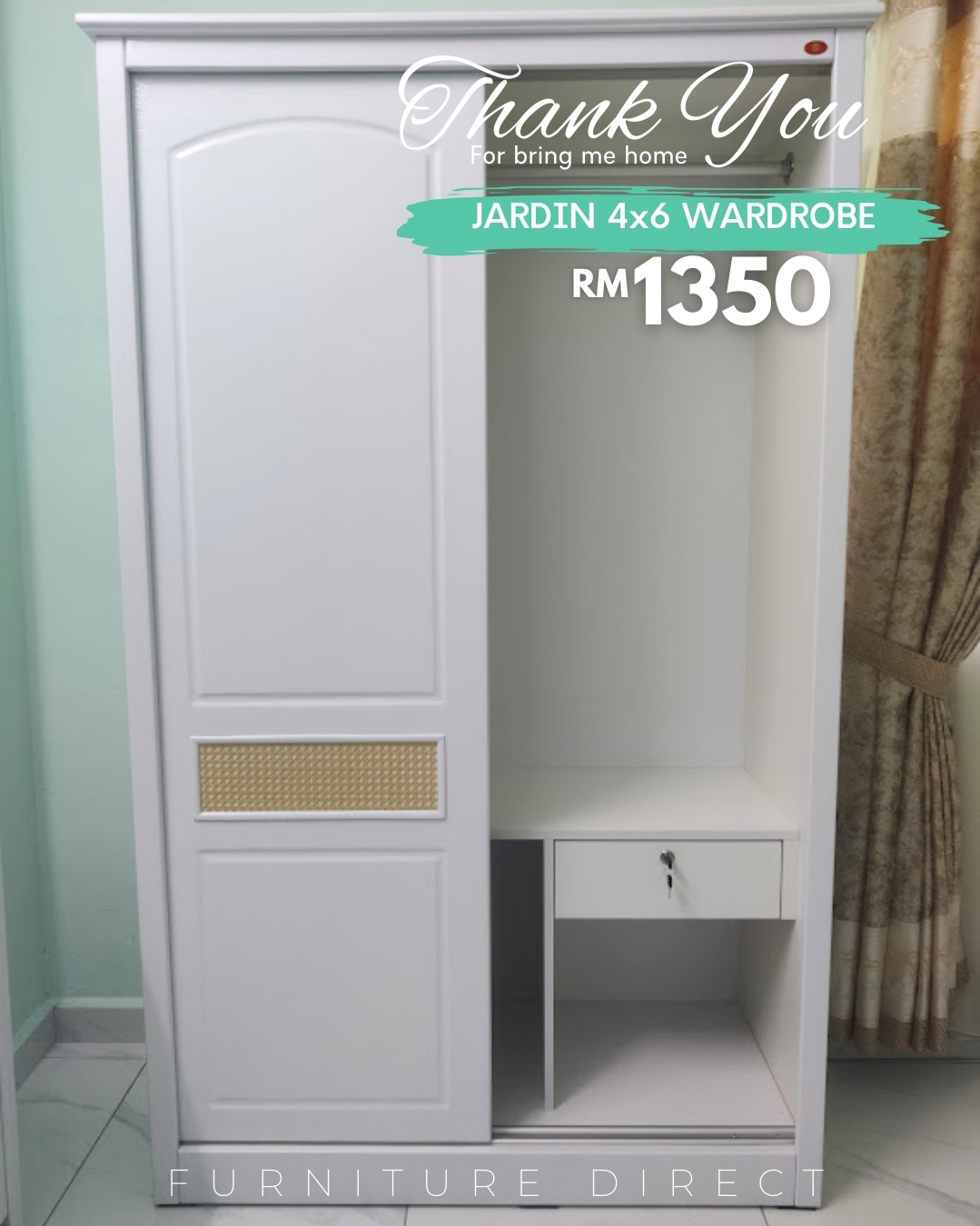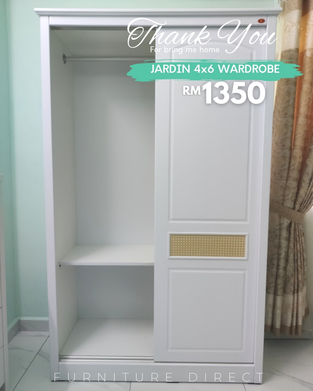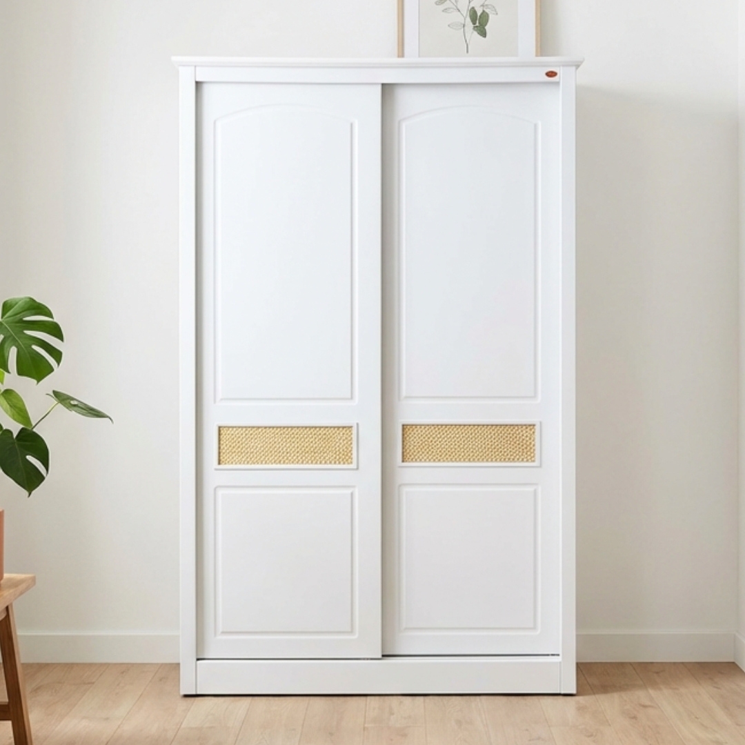 JARDIN 法式系列 4尺x6尺平开滑门衣柜,为您的卧室注入浪漫气息。采用纯净的白色烤漆工艺,最引人注目的是门板上精致的藤编元素(Rattan features),将法式的优雅与自然的质感完美融合。节省空间的滑门设计,结合永不过时的唯美造型,是提升居家格调的艺术之选。