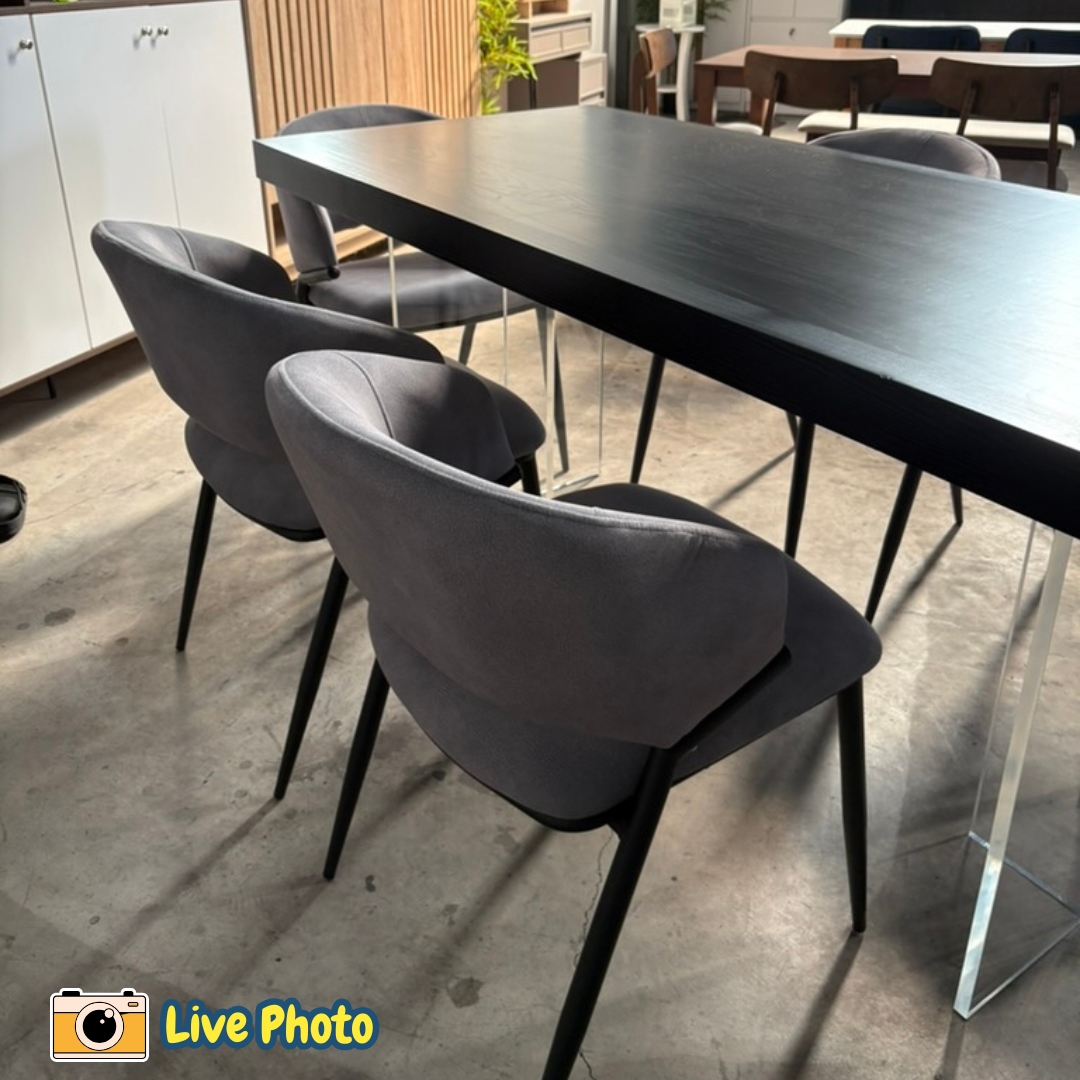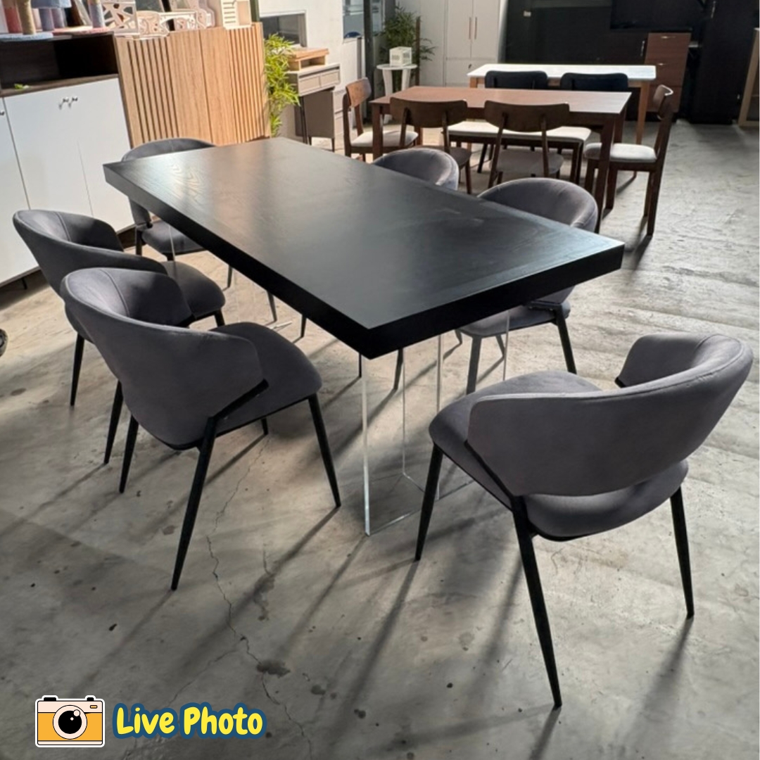 Experience modern sophistication with the SPHERE 6-Seater Dining Set in Black. This striking set features a thicker wood veneer tabletop in a sleek black finish, supported by a unique transparent acrylic base. The clear table legs create a stunning “floating” effect, making this avant-garde piece a perfect blend of bold luxury and contemporary art for your dining room.