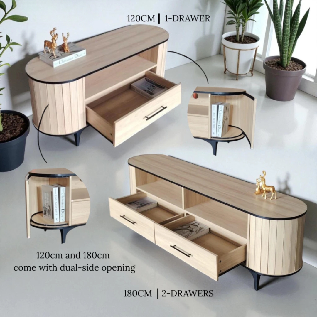 Hiasi ruang tamu anda dengan Kabinet TV Melengkung STASIA yang menawan. Dengan rekaan tekstur “flutter” yang unik dan bucu melengkung yang halus, ia membawakan sentuhan gaya moden dan elegan ke rumah anda.