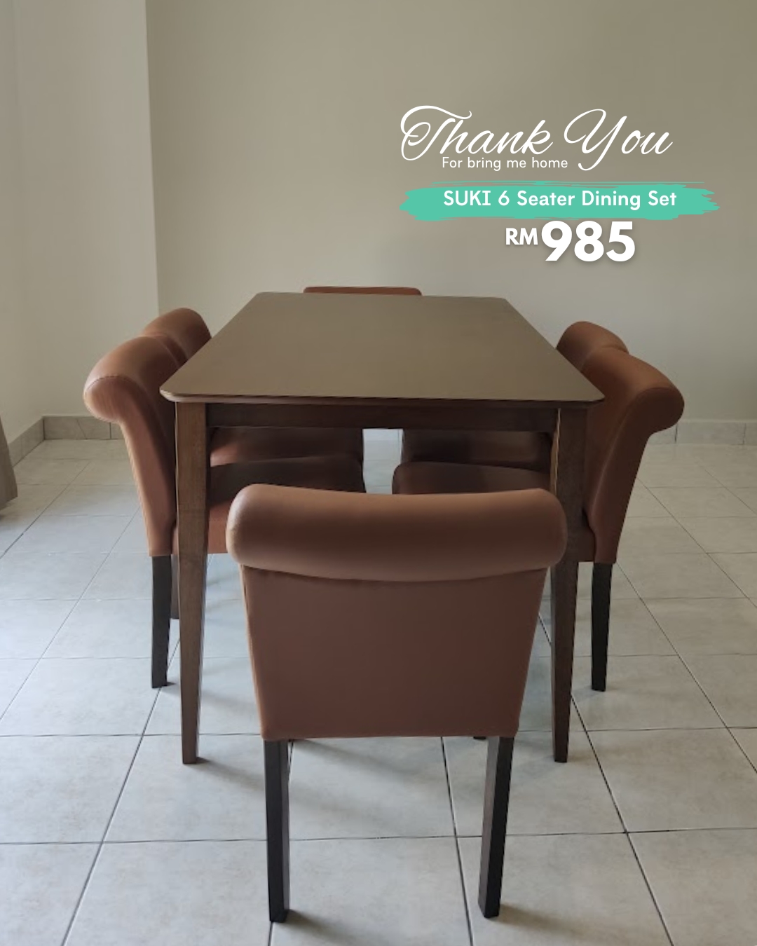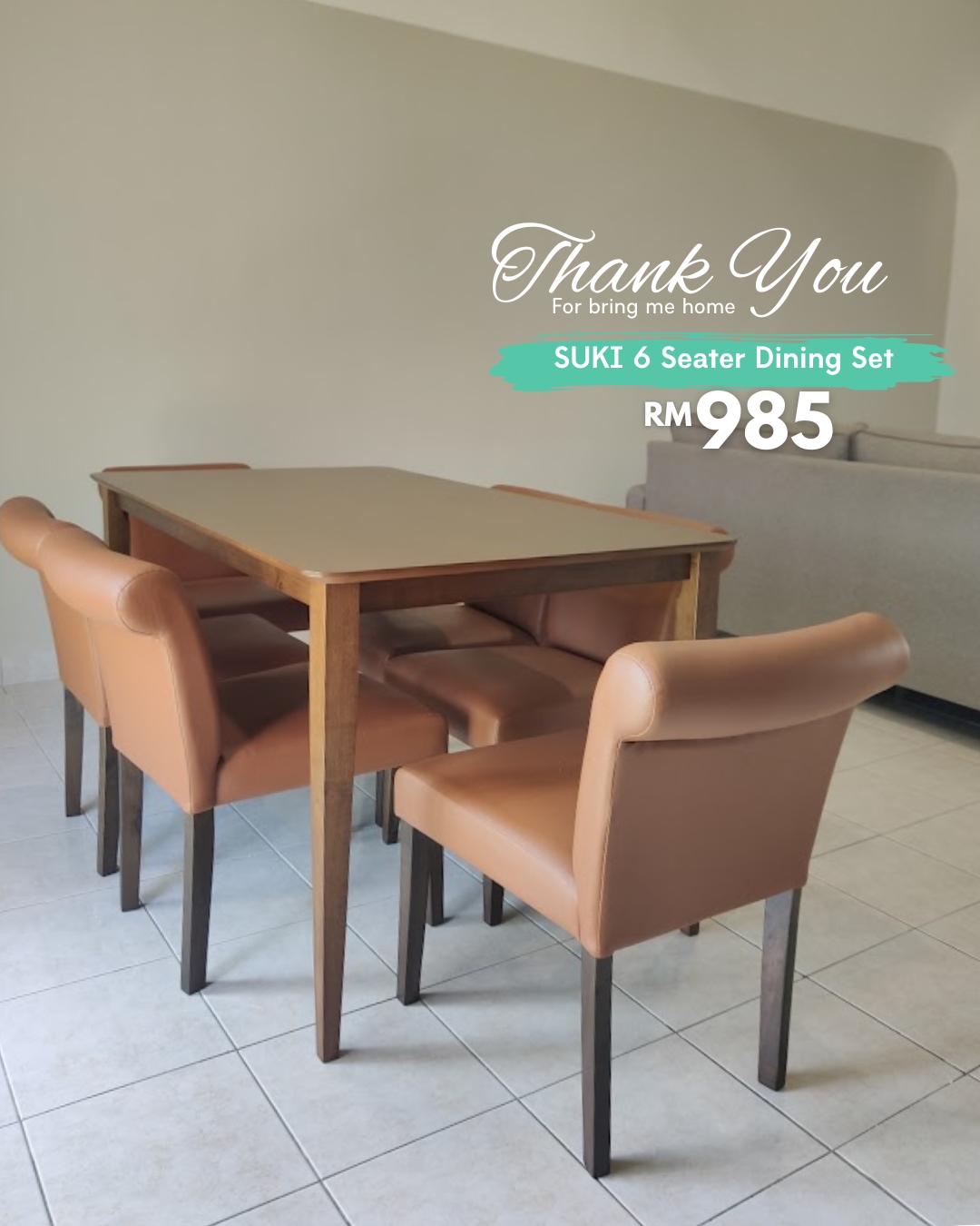 Introduce timeless elegance to your dining room with the SUKI 6-Seater Dining Set, beautifully crafted from solid rubberwood for long-lasting durability. This set includes six chairs upholstered in high-quality PU cushions, offering both comfort and a touch of luxury. The simple yet classic design makes it versatile enough to blend into any decor style, from modern to traditional. Ideal for family meals and hosting dinner parties, the SUKI dining set is a perfect combination of style and functionality.