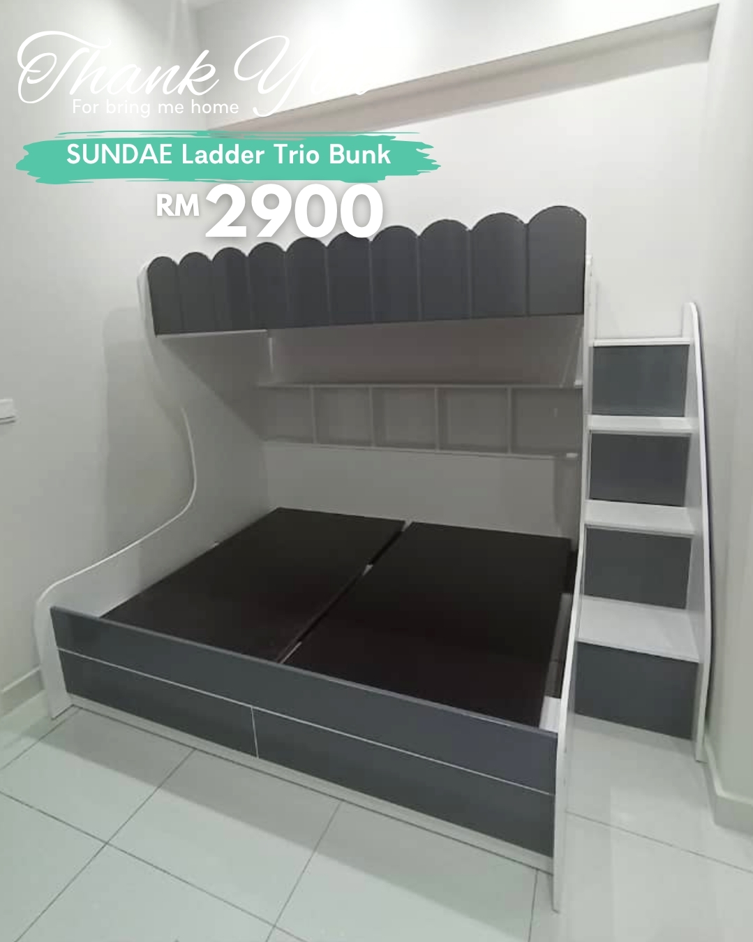 Katil Bertingkat Trio SUNDAE dengan Laci Simpanan direka dengan kombinasi single di atas + queen di bawah, sesuai untuk kegunaan keluarga. Tingkat bawah dilengkapi laci simpanan untuk pakaian, mainan atau barangan harian. Tangga sisi kukuh memastikan akses yang mudah dan selamat. Penyelesaian praktikal untuk bilik kanak-kanak atau bilik berkongsi.