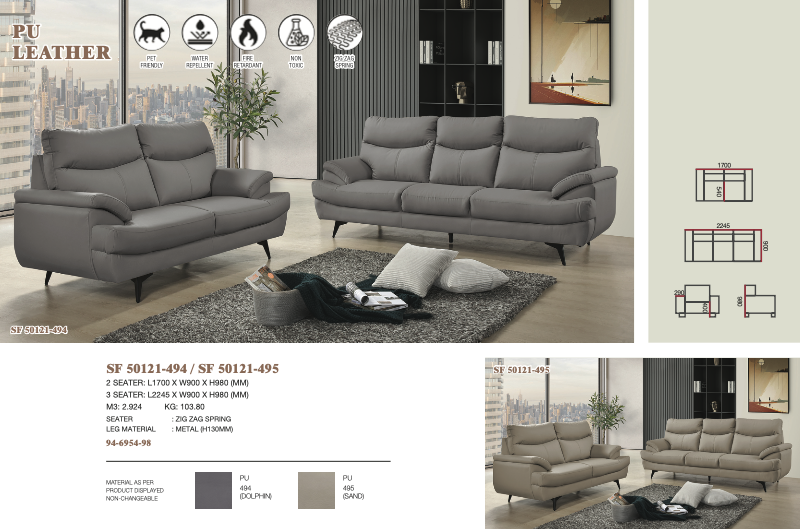 TESSA 2+3 宠物友好PU沙发套装,采用易清洁宠物友好PU面料,防刮耐磨,养宠家庭更安心。内置实木框架与Z字形弹簧底座,稳固承托,持久舒适。金属沙发脚设计,时尚大方。提供 沙色与灰色 两种颜色选择,百搭各种家居风格。