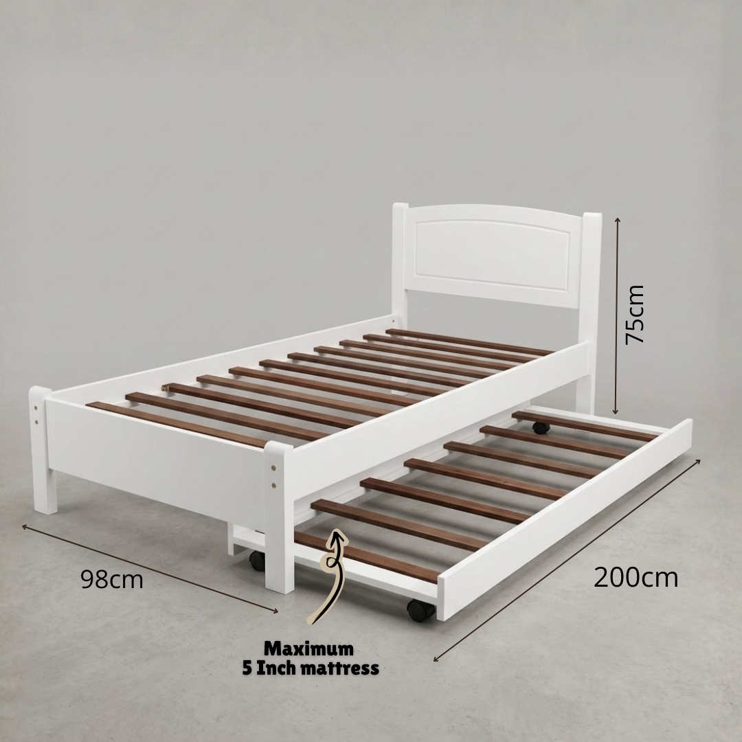 The THOMAS Single Size Pull-Out Bed is built with solid rubberwood and MDF in painted finishing for strength and style. Featuring a solid hardwood slat base for durability, the pull-out design saves space while providing an extra bed. The trundle fits mattresses up to 5 inches only—ideal for kids’ rooms, compact homes, or guest spaces.