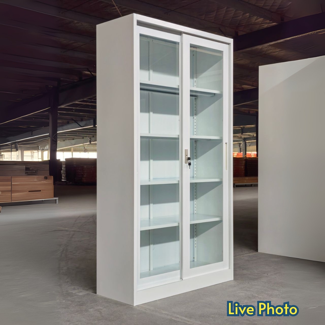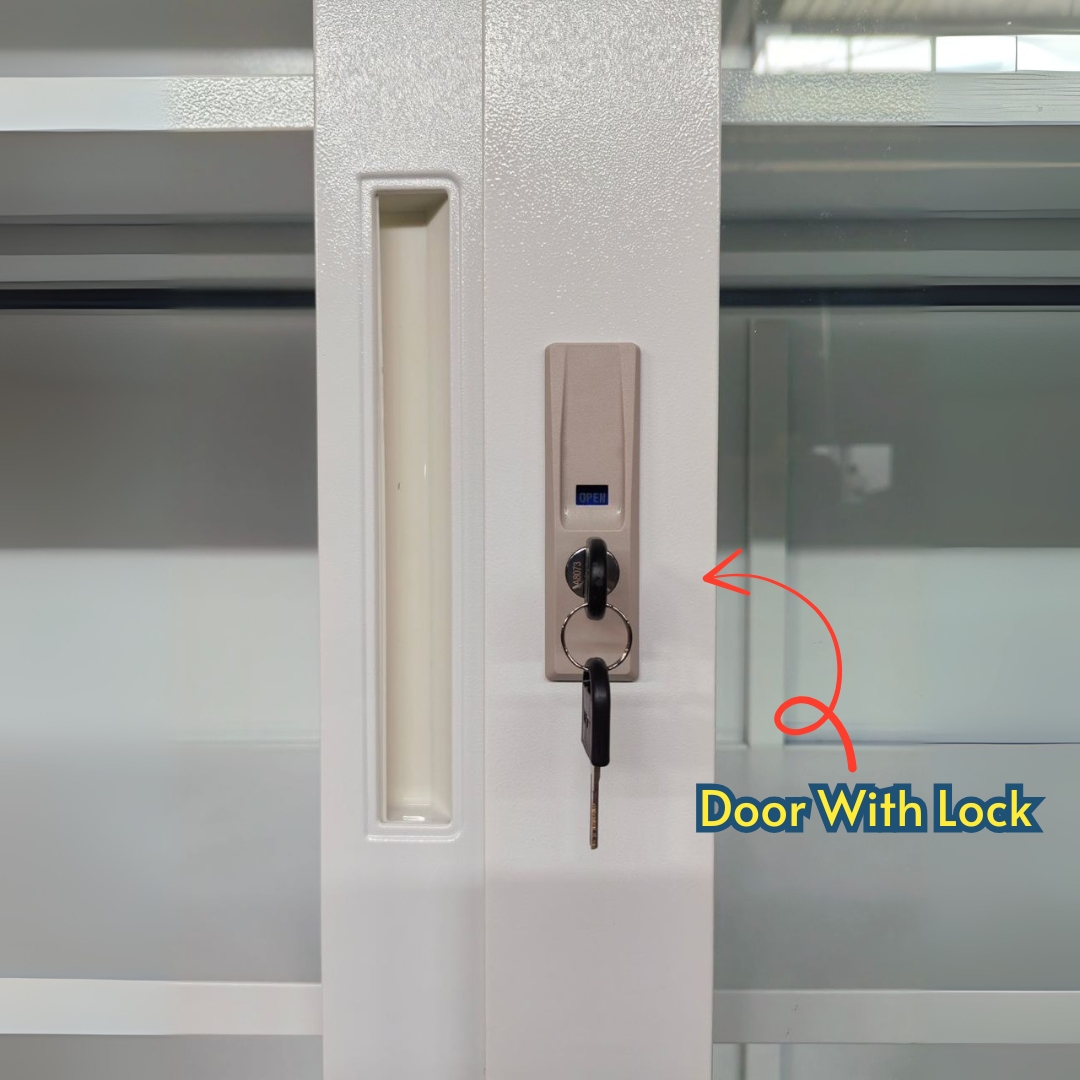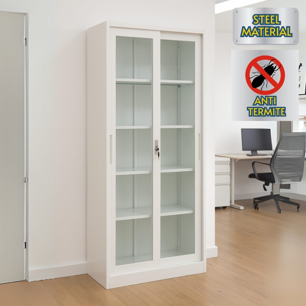 The TIOLA 2 Sliding Door Full Steel Filing Cabinet is built for durability and secure storage. Made from anti-termite full steel material, it features two glass sliding doors with key locks for added safety. The adjustable shelves provide flexible storage for documents, books, or office supplies—ideal for both home and office use.