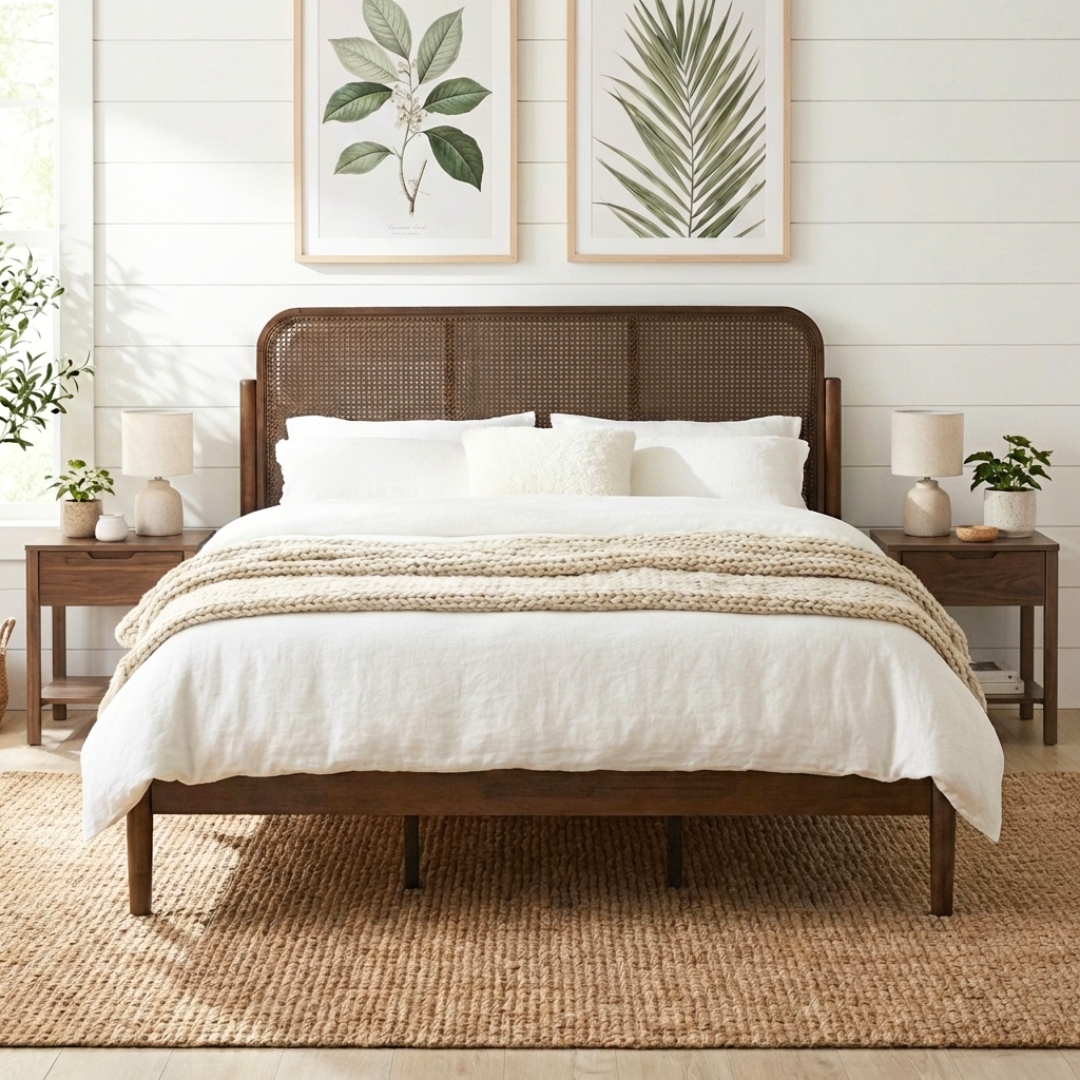 TRENTO Queen Size 实木床架,为您打造宁静舒心的睡眠空间。采用坚固耐用的全实木框架,床头板融入了精致的藤编元素,展现出自然轻盈的设计美感。备有原木色 (Natural) 与 胡桃木色 (Walnut) 供选:原木色清新明亮,胡桃木色则沉稳大气,是追求质感生活的理想之选。
