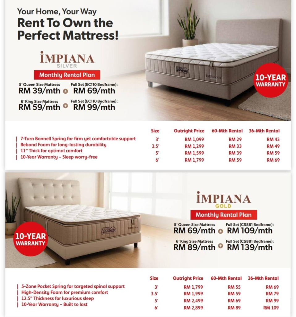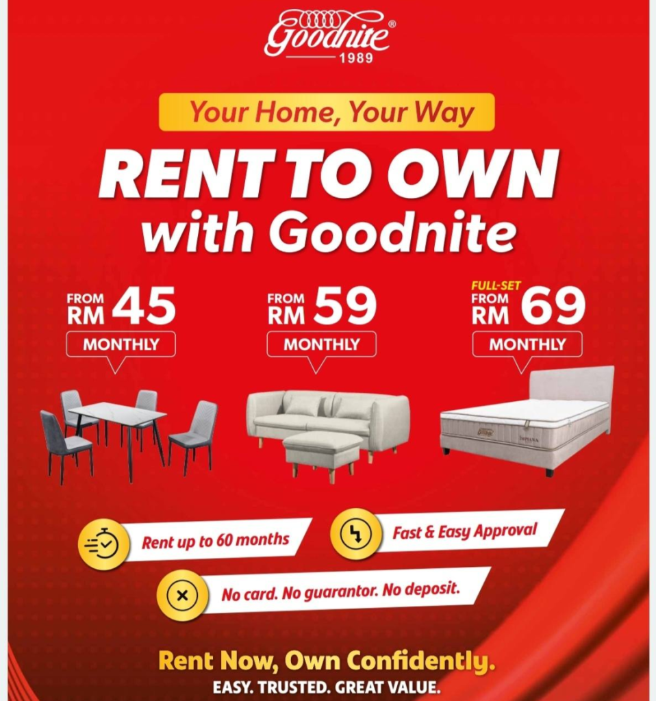 Rent-to-Own is a flexible payment program by Goodnite International Sdn. Bhd. that allows you to rent furniture over a fixed 36 or 60-month term, with ownership automatically transferred to you at the end of the period.